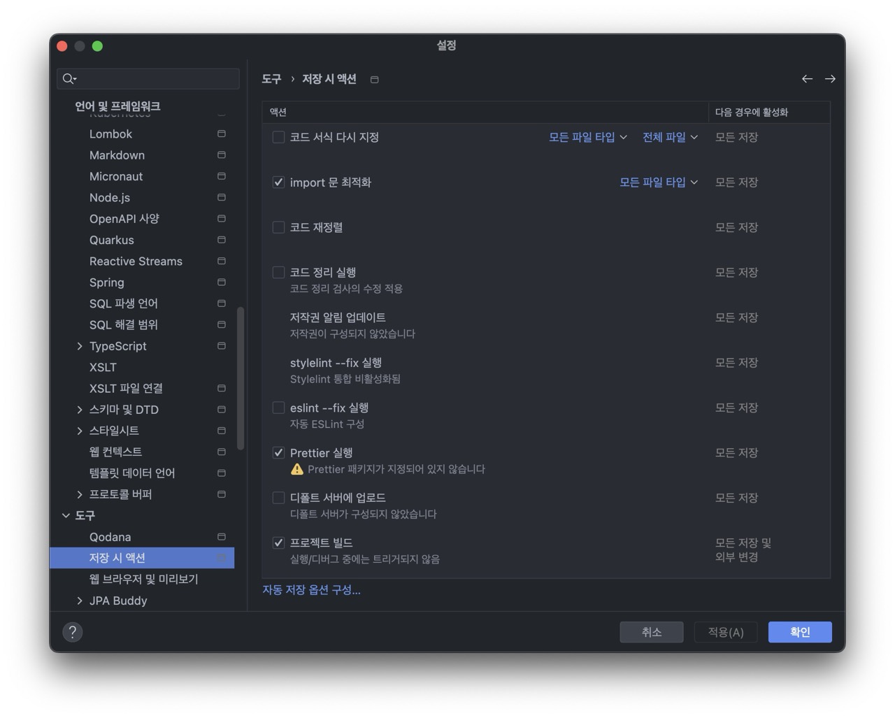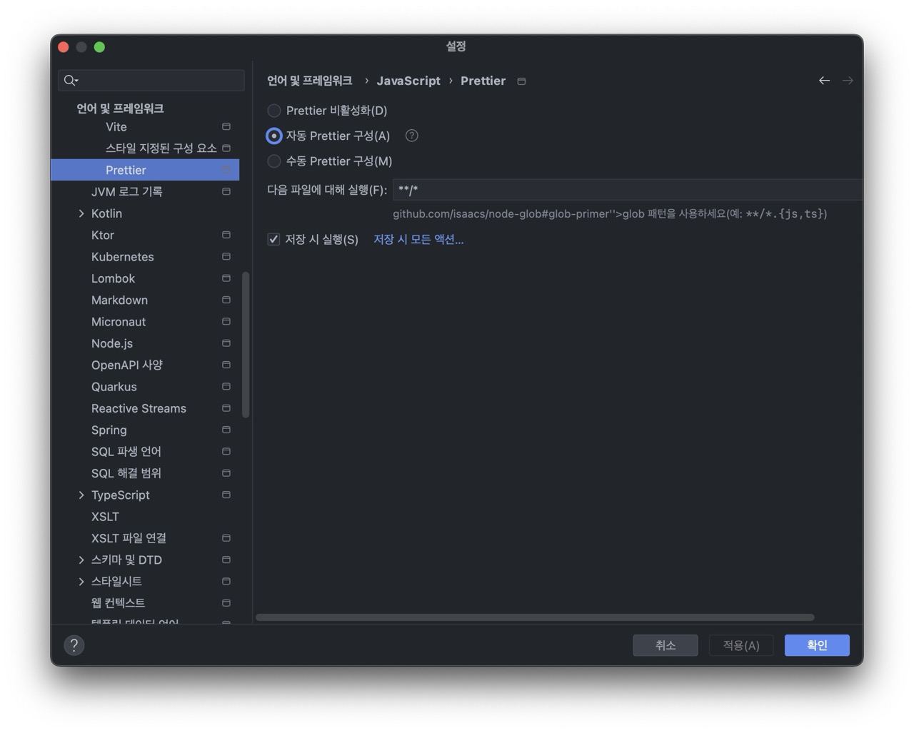 Prettier 실행에 체크 표시를 해준 후 마우스를 올려구성...에 들어갑니다.